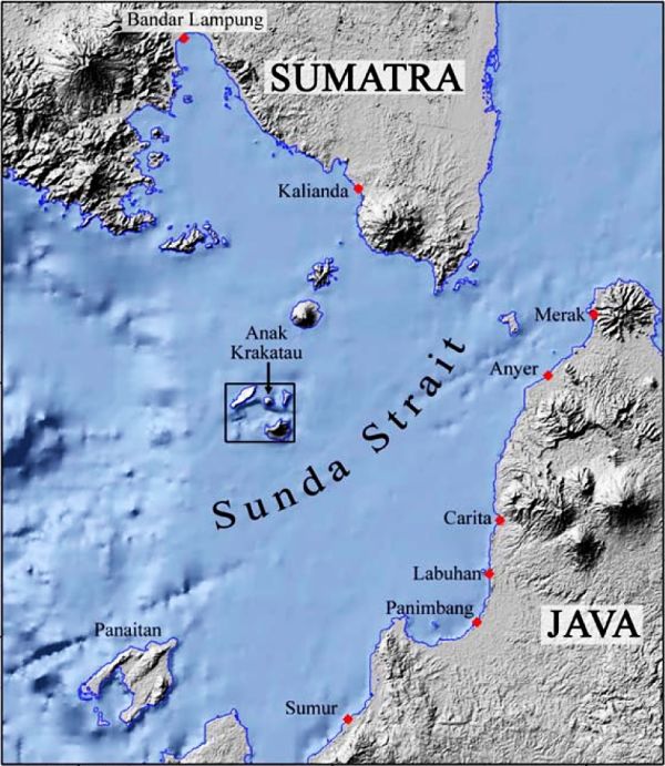 Le détroit de la Sonde, dans lequel se trouve le volcan Anak Krakatau, a une orientation approximativement nord-ouest / sud-ouest, avec une largeur minimale de 24 km à son extrémité nord-est entre Sumatra et Java. Son extrémité ouest est profonde (plus de 1500 m de profondeur), mais sa profondeur diminue à mesure qu’elle se resserre à l’est, avec une profondeur d’environ 20 m dans certaines parties de l’extrémité est, ce qui rend la navigation difficile en raison des bancs de sable et des forts courants de marée.